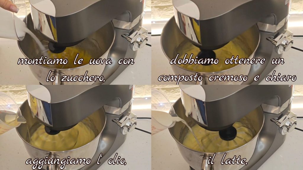 • Beat the eggs with the sugar until you obtain a light and creamy mixture. Add the oil, the milk,