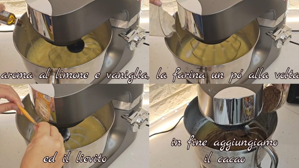• Add the lemon and vanilla flavors, the flour gradually, the baking powder, and the cocoa, and mix well.