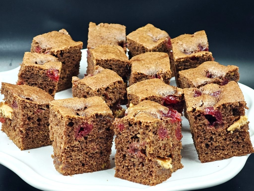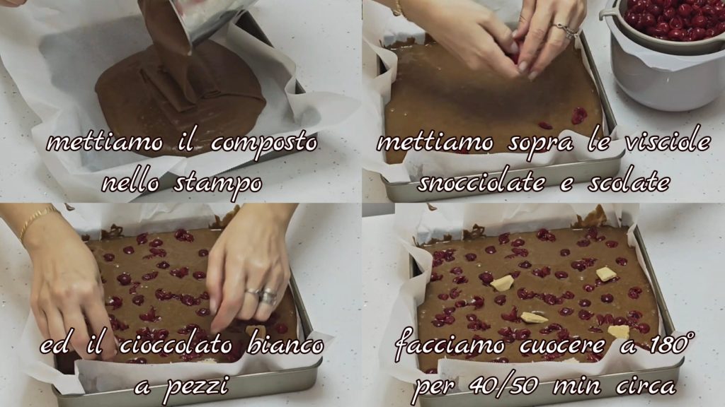 • Pour the mixture into the pan and spread over the entire surface. Place the pitted and drained sour cherries and the white chocolate pieces on top. Bake at 356°F for about 40/50 minutes.
