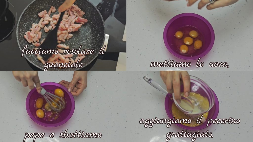 First, in a pan, brown the guanciale (it must be golden and crispy). In another pan, put the eggs, a bit of pepper, and whisk them. Add the Pecorino and mix.