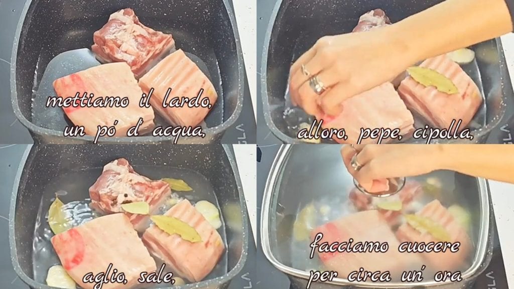 First, cut the lard into pieces and place them in a pot with a bit of water. Add some bay leaf, pepper, onion, garlic, salt, and cook for about an hour.