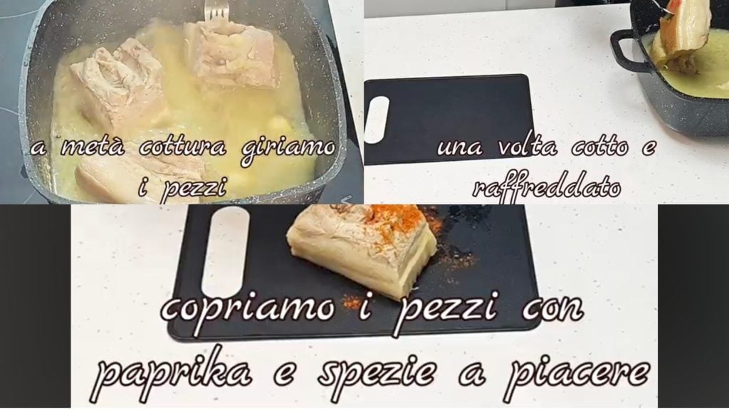 Halfway through cooking, turn the pieces of lard. Once cooked, let them cool well, then take one piece at a time and cover with paprika and spices to taste.