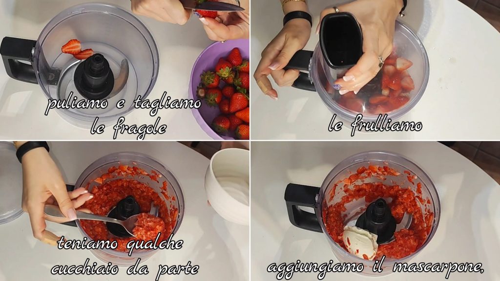 First, clean and chop the strawberries and blend them. Set aside 2/3 tablespoons of the mixture then add the mascarpone.