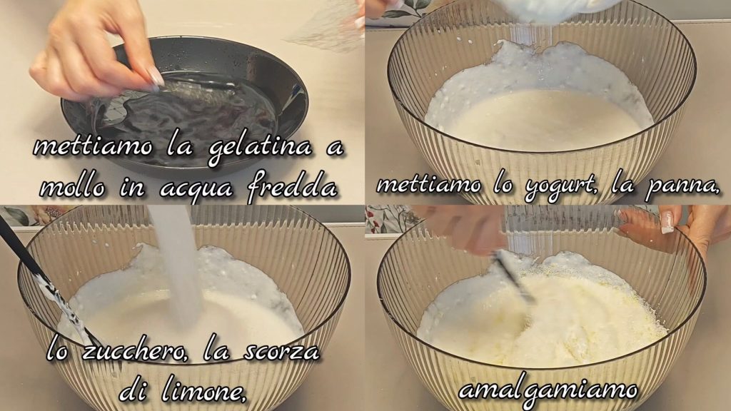 First, soak the gelatin in cold water. In a bowl, combine yogurt, cream, sugar, and lemon zest.