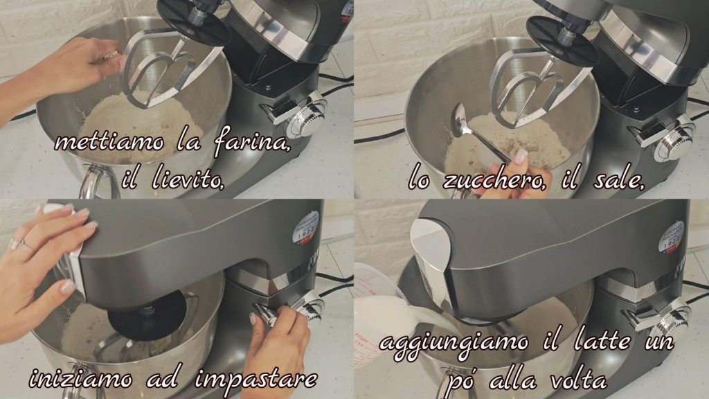 We put the flour, yeast, sugar, salt, and start kneading. Add the milk gradually