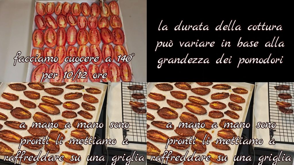 Cook them at 284°F for about 10/12 hours. The cooking time may vary depending on the size of the tomatoes. As they start to be ready, remove them and place them on a rack to cool.