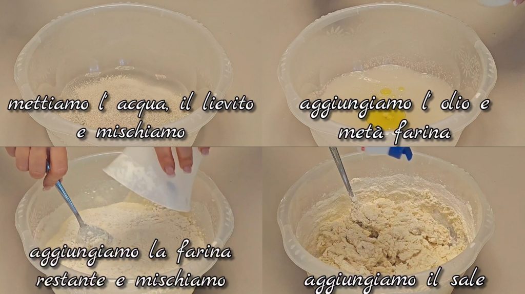 In a bowl, dissolve the yeast in the water and mix. Add half of the flour and the oil, mixing well. Add the remaining flour and finally the salt. Knead until you obtain a smooth dough.