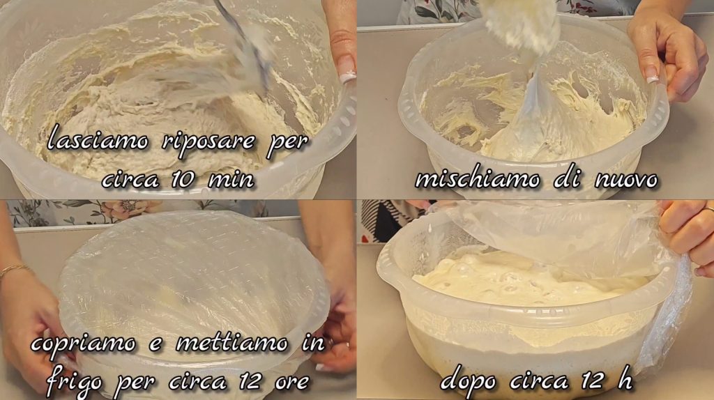Let the dough rest for about 10 minutes, then mix again, cover with plastic wrap, and place in the fridge for about 12 hours