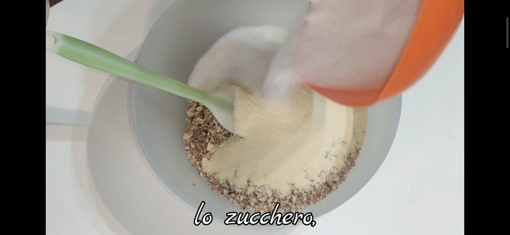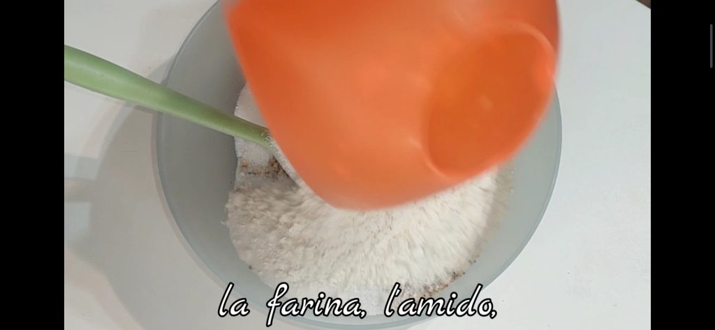 Chop the almonds, add the semolina, sugar, flour, corn starch, and mix.