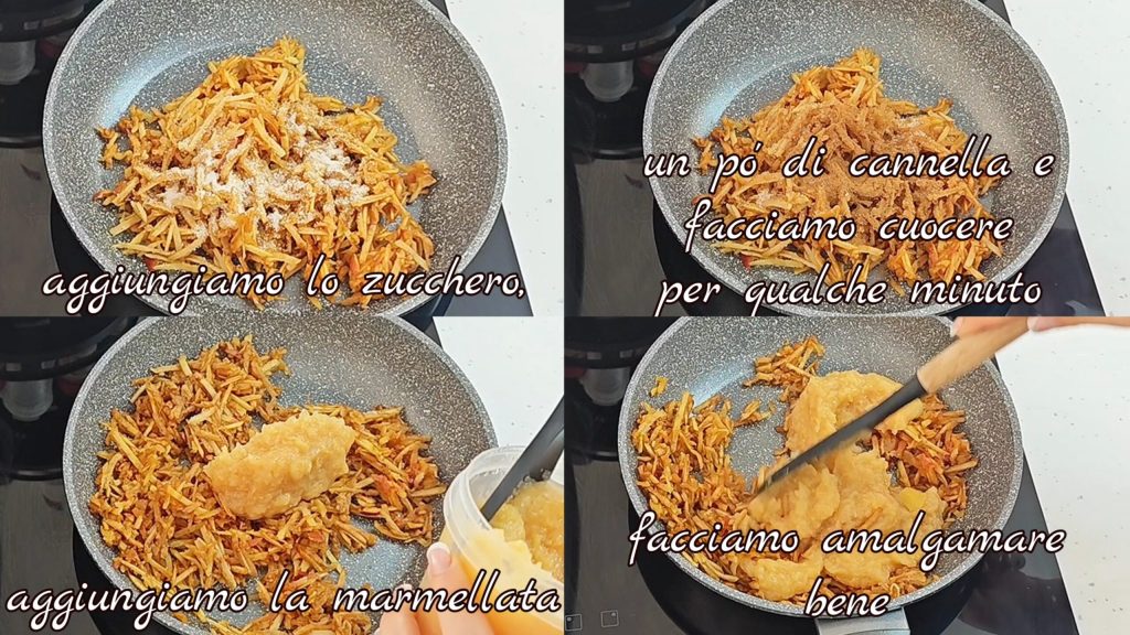 add sugar, a bit of cinnamon and let it cook for a few minutes. We also add the jam, mix well