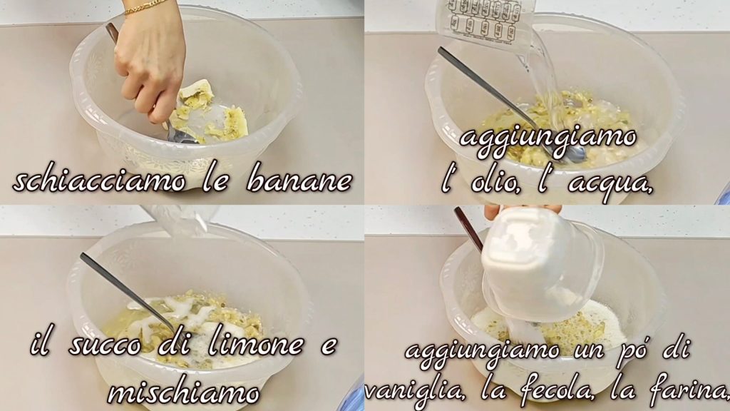 First, in a bowl, mash the bananas with a fork. Add the oil, water, lemon juice, and mix. Add a bit of vanilla, the potato starch, the flour,