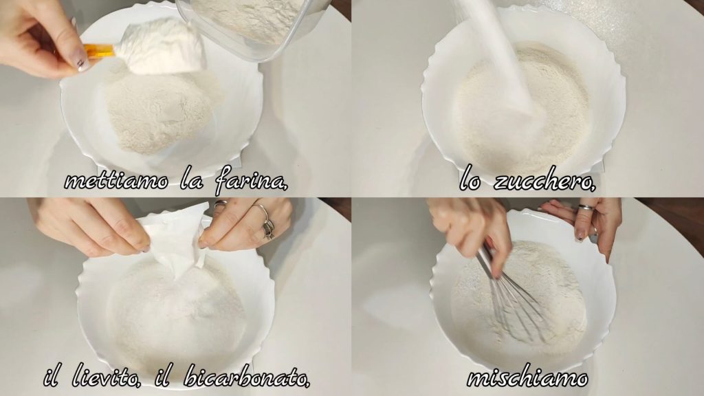 In a bowl, put the flour, sugar, baking powder, baking soda, and mix.