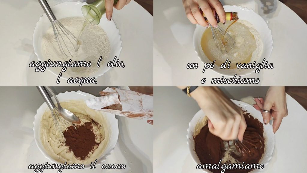 Add water, oil, a bit of vanilla, and mix again. Add cocoa and mix well.