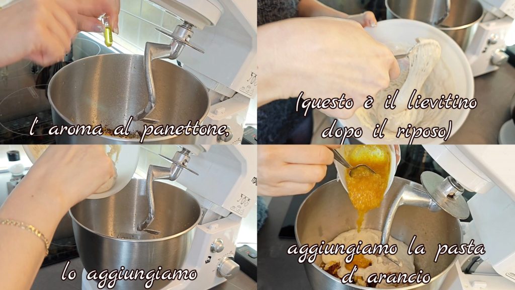 • Add the panettone flavoring, the pre-ferment (after resting), and the orange paste