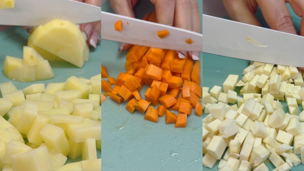 Peel the potatoes, carrots, and celeriac
