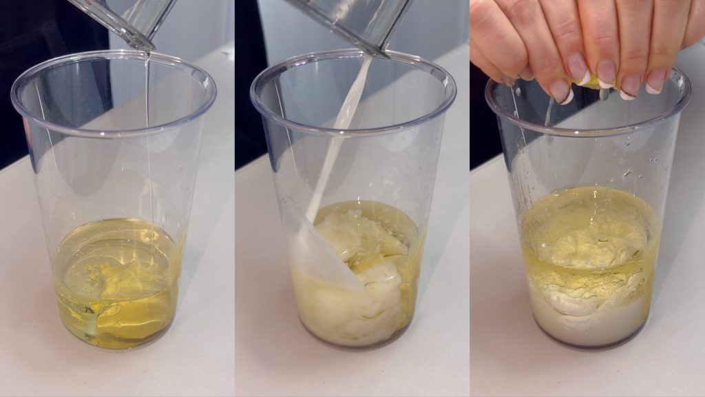 Pour the immersion blender glass with oil, soy milk, mustard, lemon juice, and a pinch of salt.