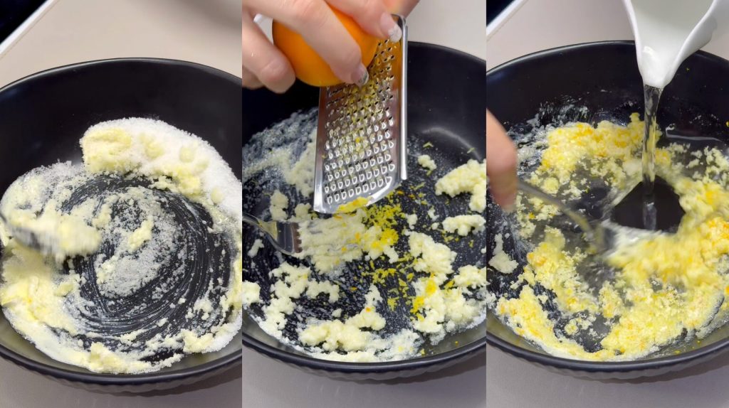 In a bowl, place the margarine, sugar, lemon zest, orange zest, and vanilla aroma. Add the water