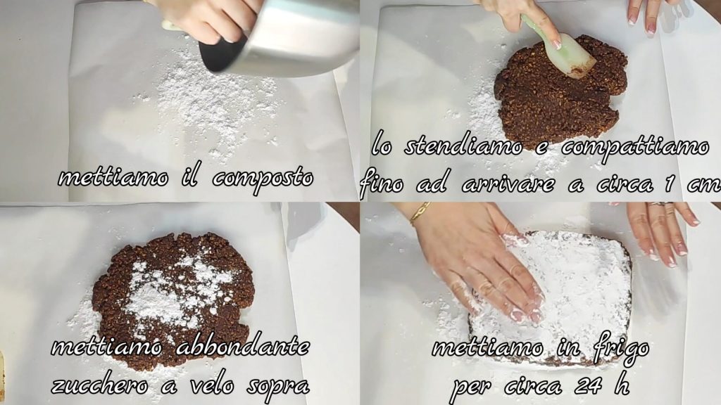 Add the mixture. Compact and level it with a spatula to about 0.4 inches thick. Cover it with a generous layer of powdered sugar and shape it with your hands into a rectangle. Refrigerate for about 24 hours.