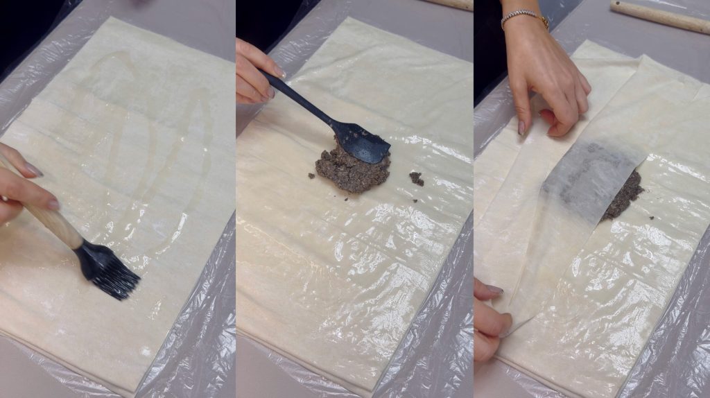 Place a bit of the mushroom filling in the center of the phyllo sheet.