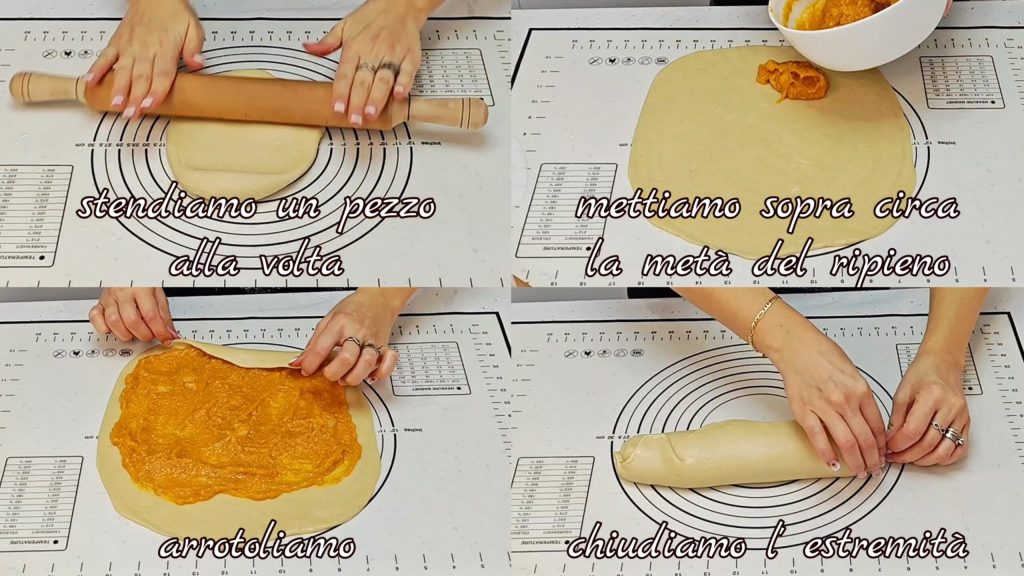• Roll out one piece at a time and place about half of the filling on top. Roll it up and seal the ends well.
