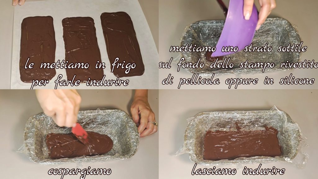 Place the outlines in the fridge or freezer for a few minutes to harden the chocolate. Lay a thin layer of chocolate (what’s left) at the bottom of the mold lined with plastic wrap or use a silicone mold. Put it in the fridge for a few minutes to harden the chocolate.