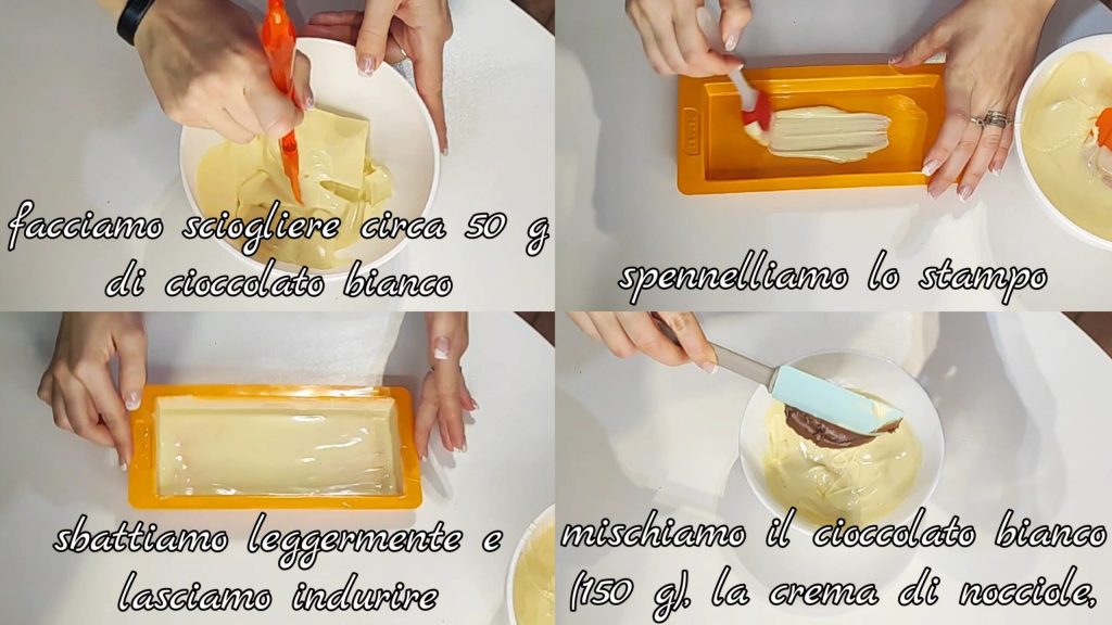 • Melt about 2 oz of white chocolate in a bain-marie or microwave and brush the nougat mold, covering the entire surface including the edges. Tap lightly and place in the fridge to harden. Melt the white chocolate for the filling (5.25 oz) and mix it with the hazelnut cream.