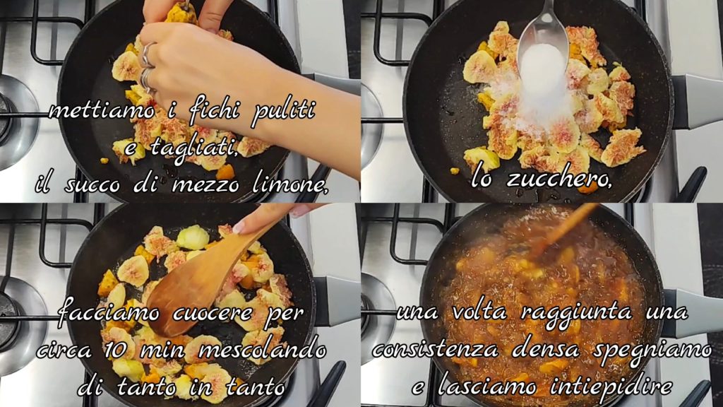 In a pan, place the cleaned and sliced figs, the juice of half a lemon, the sugar, and cook for about 10 minutes, stirring occasionally. Once it reaches a dense consistency, turn off the heat and let it cool.