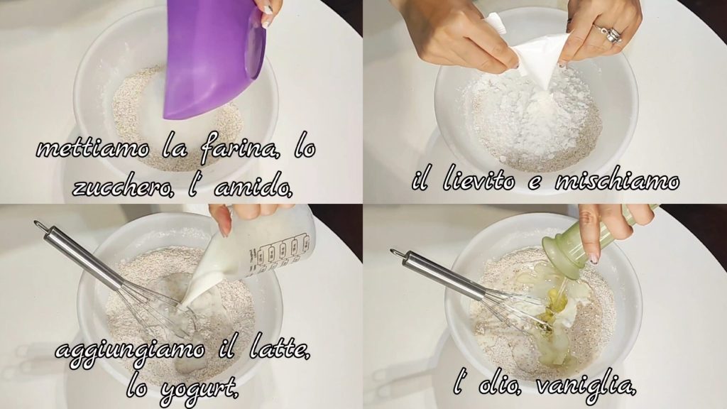 In a bowl, put the flour, sugar, starch, baking powder and mix. Add the milk, yogurt, oil, vanilla.