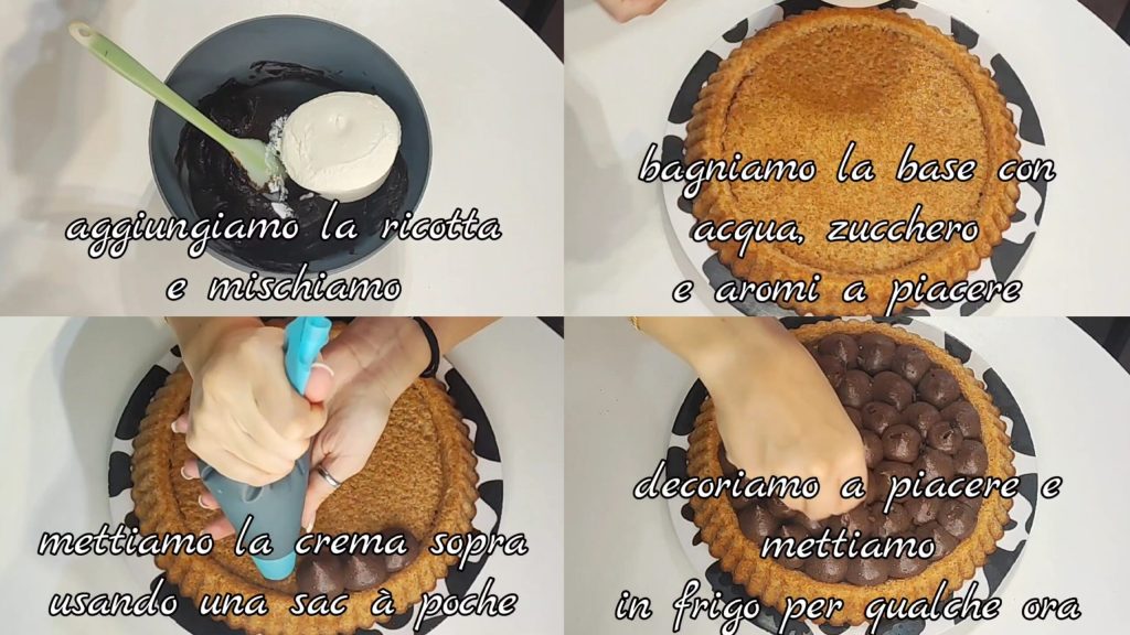 Add the ricotta and mix well. Moisten the base with water and sugar and flavors to taste. Put the cream on top using a piping bag. Decorate as desired and refrigerate for a few hours.