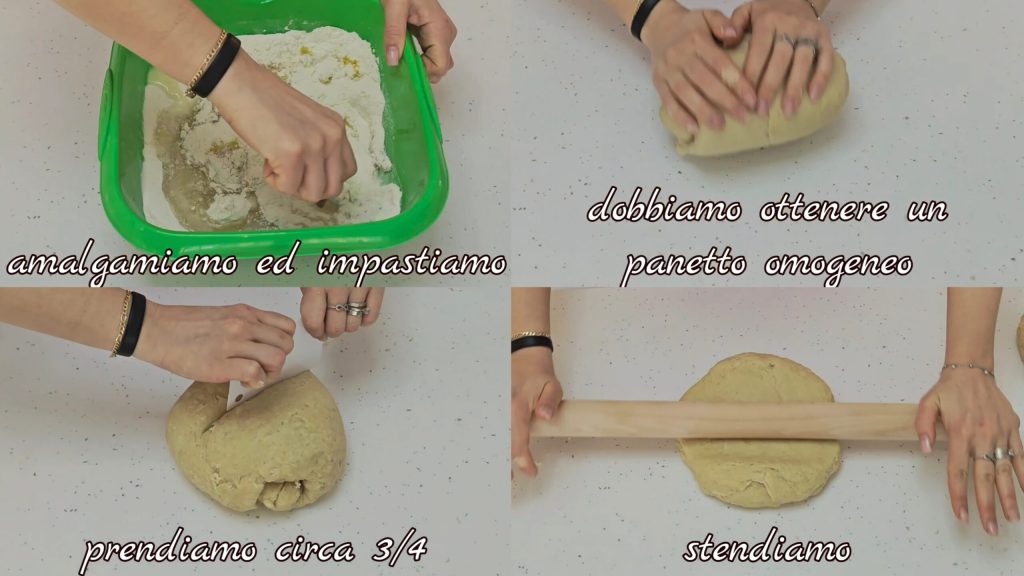 • Mix and knead until you get a homogeneous dough. Take about 3/4 of the dough and roll it out, using a bit of flour if necessary.