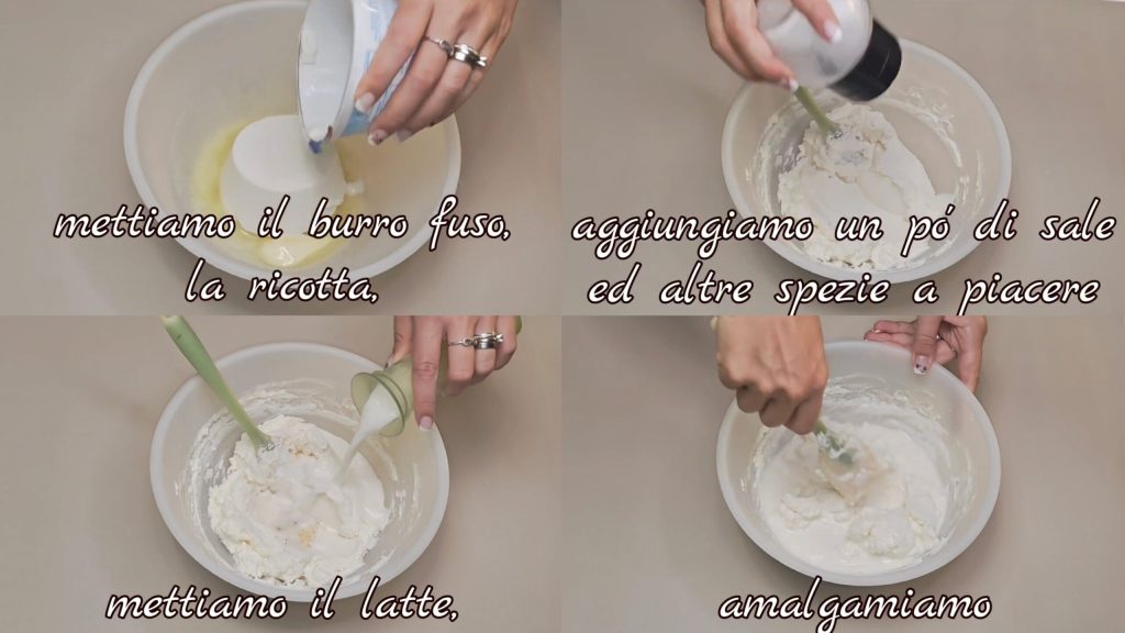 Add the melted butter, ricotta, a bit of salt, and other spices to taste. Add the milk,