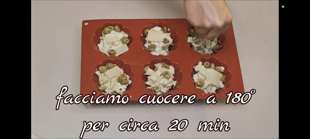 Put the mixture into the molds using a spoon. Add a little mozzarella cubes, Parmesan, olives, and spices to taste on top.