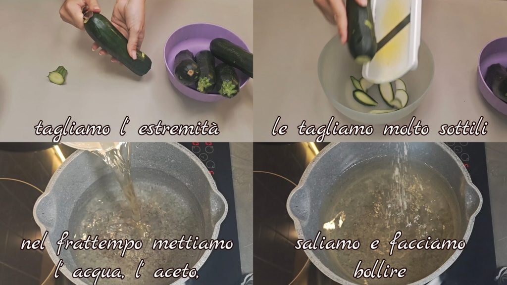 • First, we carefully wash and then dry the zucchinis. Cut off the ends and then slice them very thin using a mandoline grater or a peeler. Meanwhile, boil the water, vinegar, and a pinch of salt.