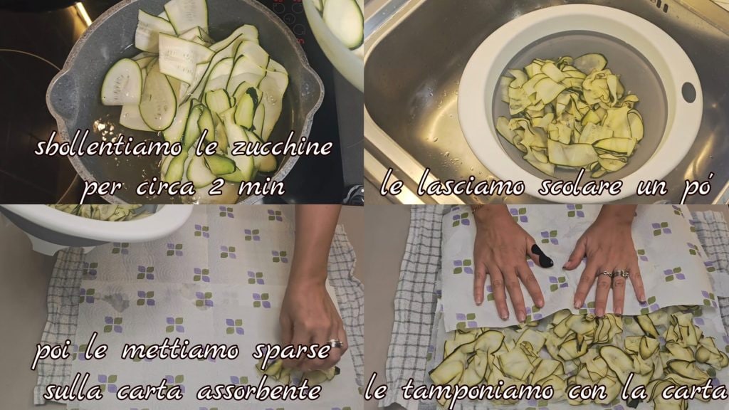 • Blanch the zucchinis for about 2/3 minutes then let them drain for a few minutes. Spread them on paper or a clean towel. Pat them with some paper towels.