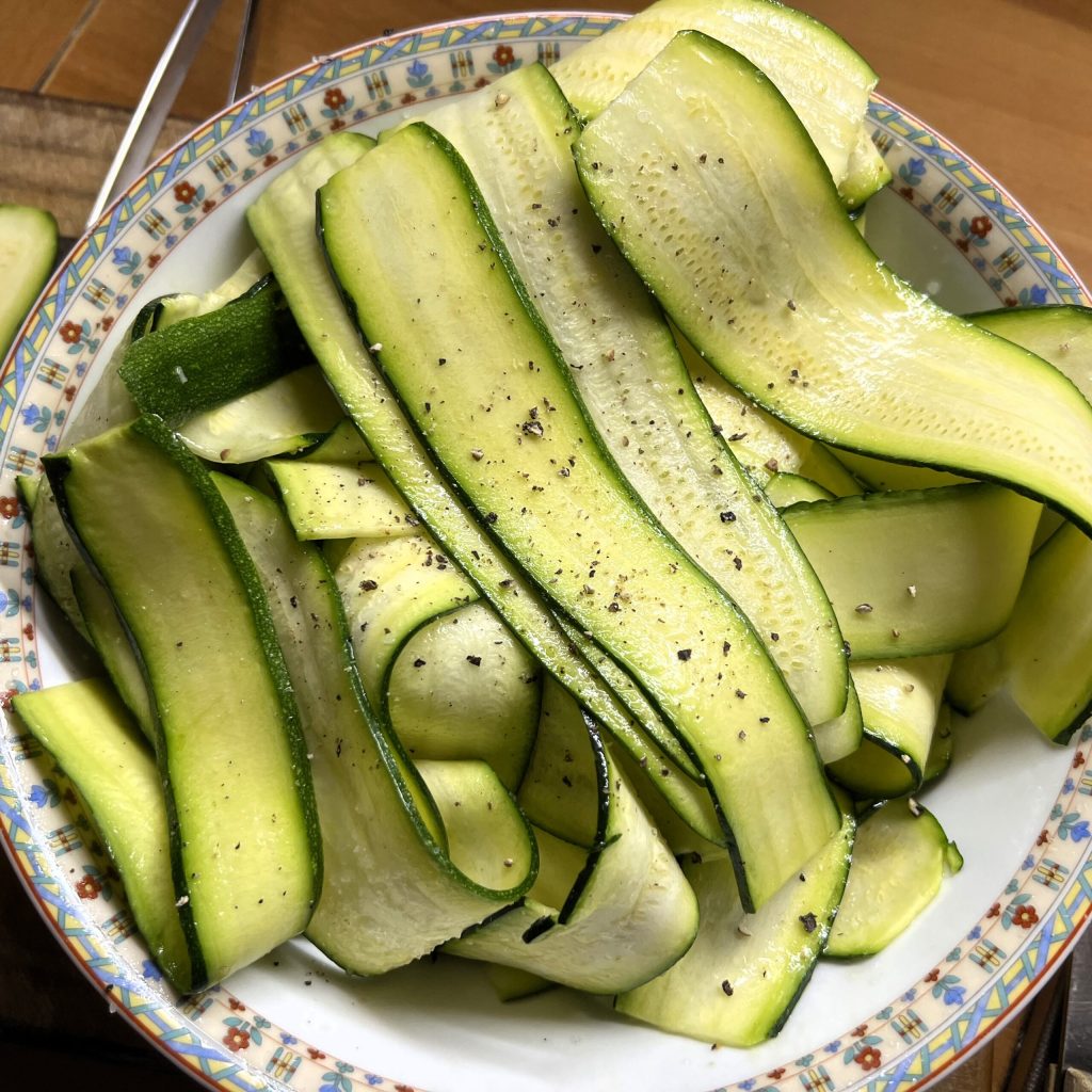 Place the sliced zucchini in a bowl and season with a drizzle of oil, a pinch of salt, and some freshly ground black pepper