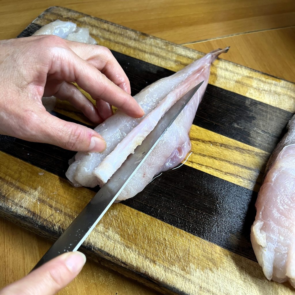Fillet the monkfish by removing the central bone with a knife