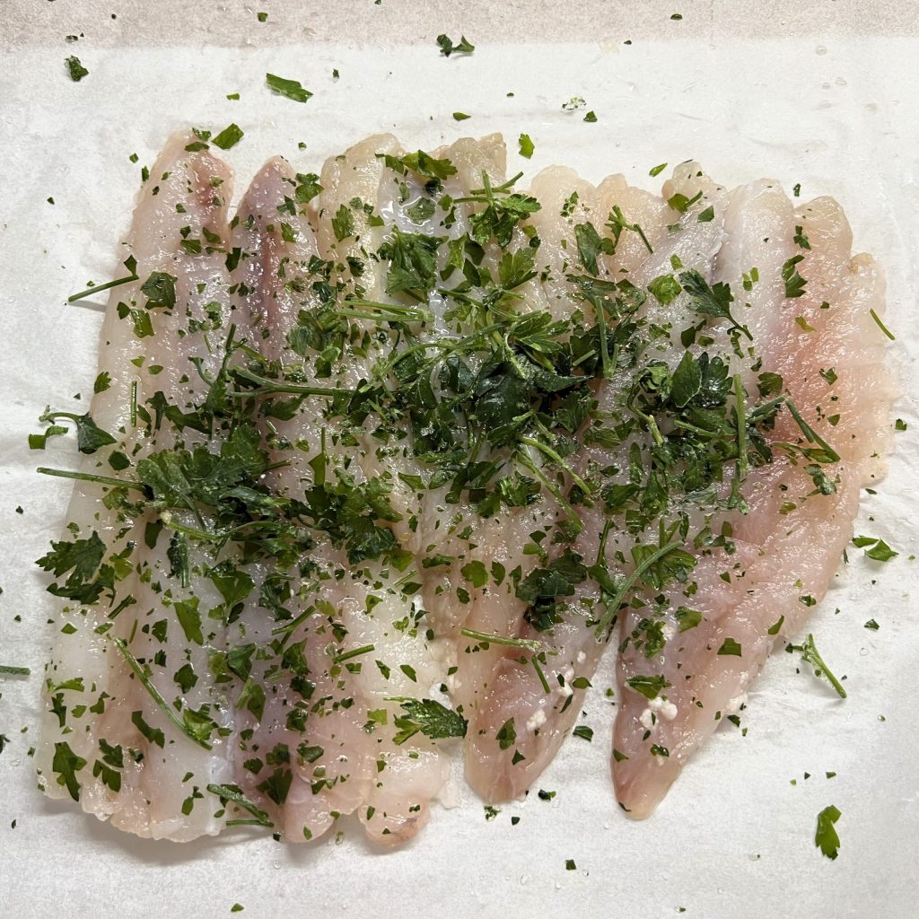 Cover with a second sheet of parchment paper and gently pound with a meat tenderizer to slightly flatten the fish