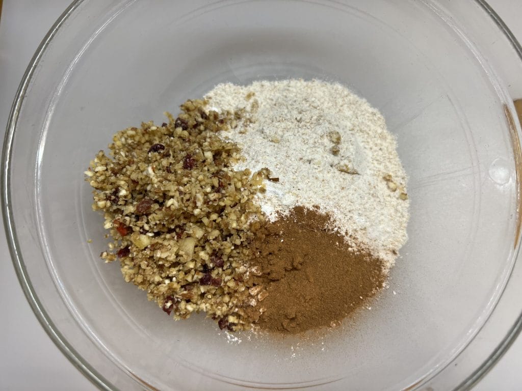 In a bowl, mix all the dry ingredients: flour, chopped dried fruits, cinnamon, and baking powder.