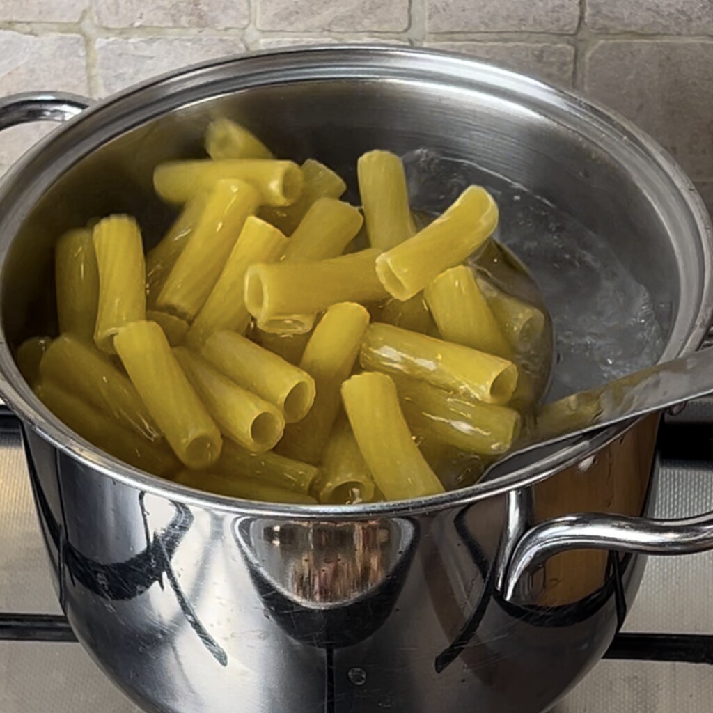 Preparing pasta frittata carbonara style is really simple and quick. First, bring the water for the pasta to a boil and preheat the oven to 392°F