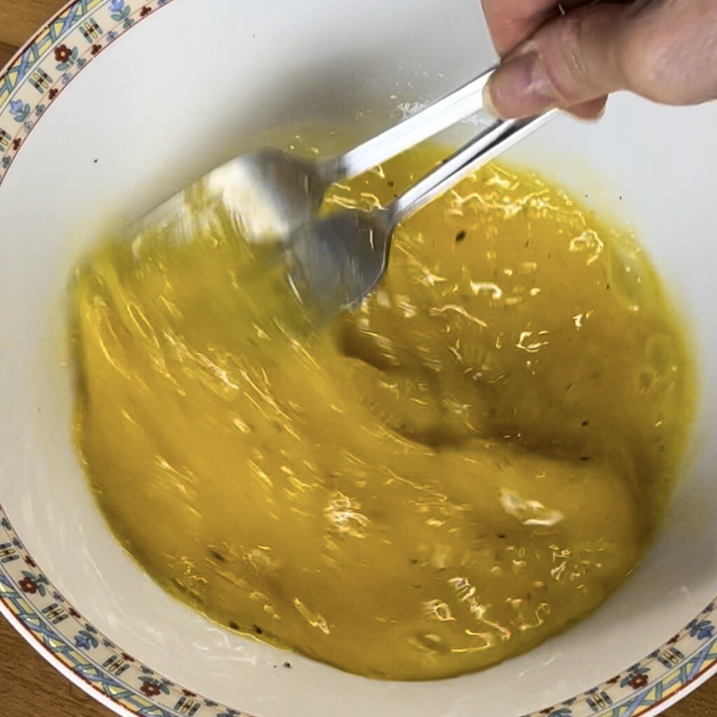 Drain the pasta al dente and mix it with the beaten egg in the bowl