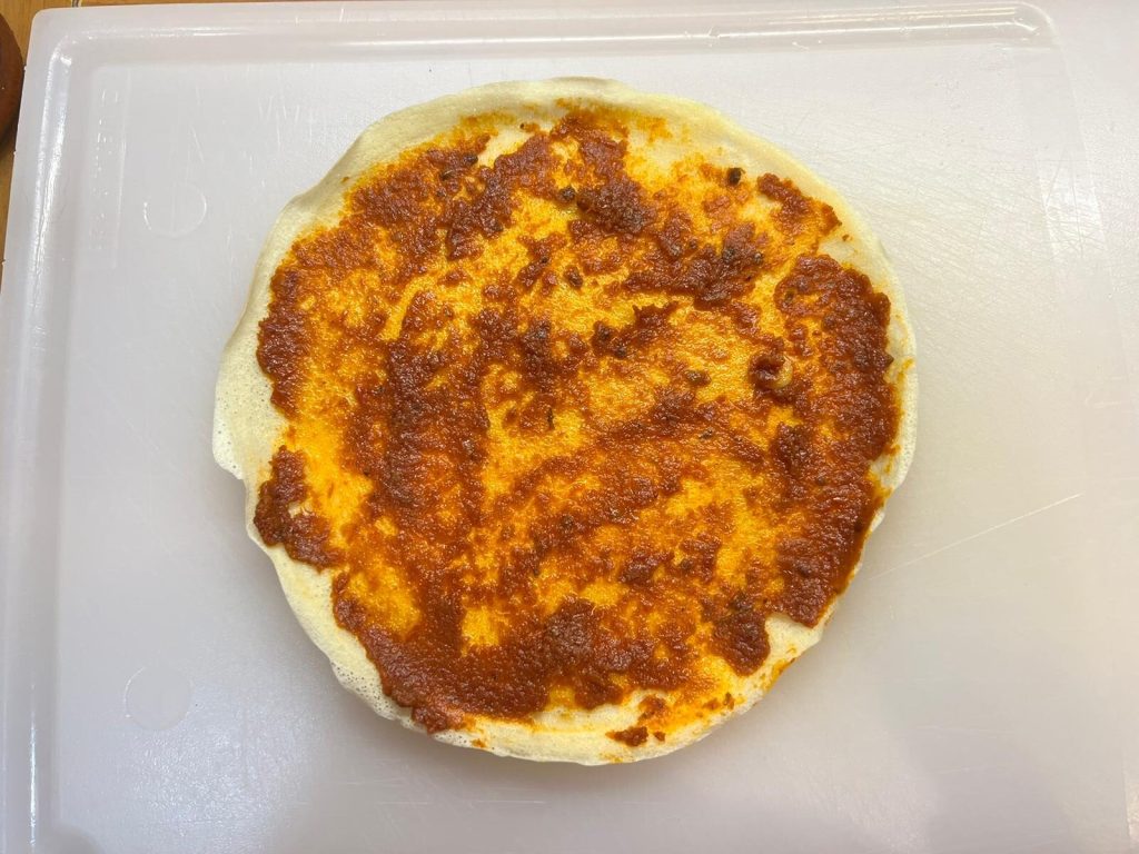Lay a crepe on the cutting board and spread it evenly with sun-dried tomato pesto.