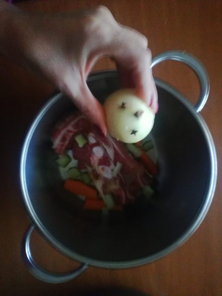 Insert the whole cloves into the whole onion and add it to the pot;