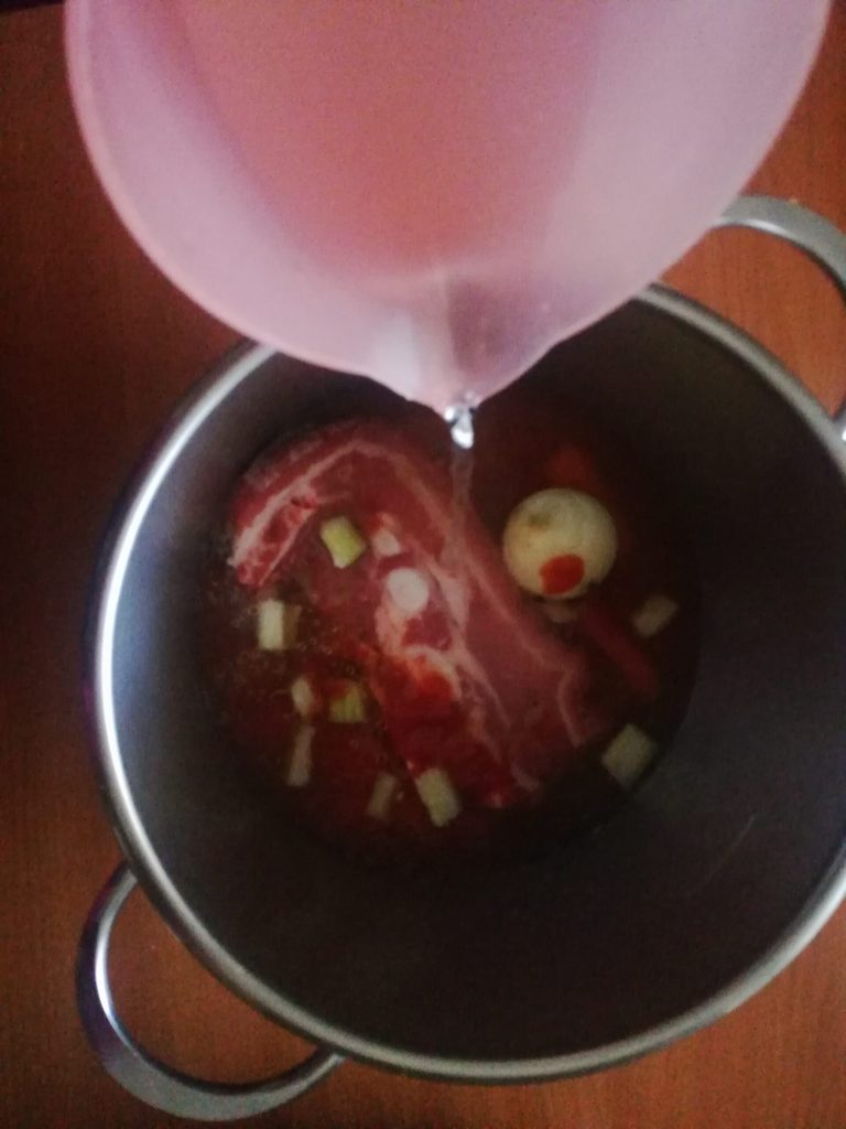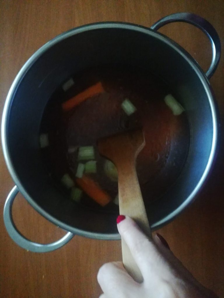 Clean the carrots, celery and onion and put everything in the pot together with the piece of meat;