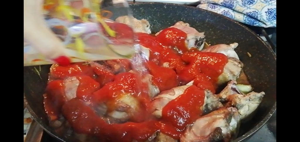 A dish based on chicken thighs and drumsticks first seared skin-side down, flavored with herbs and either tomato purée or tomato pulp for those who prefer it.