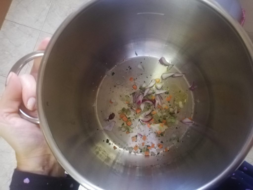 First, peel and finely chop the celery, carrot, and onion and gently sauté them in the pot with some extra virgin olive oil;