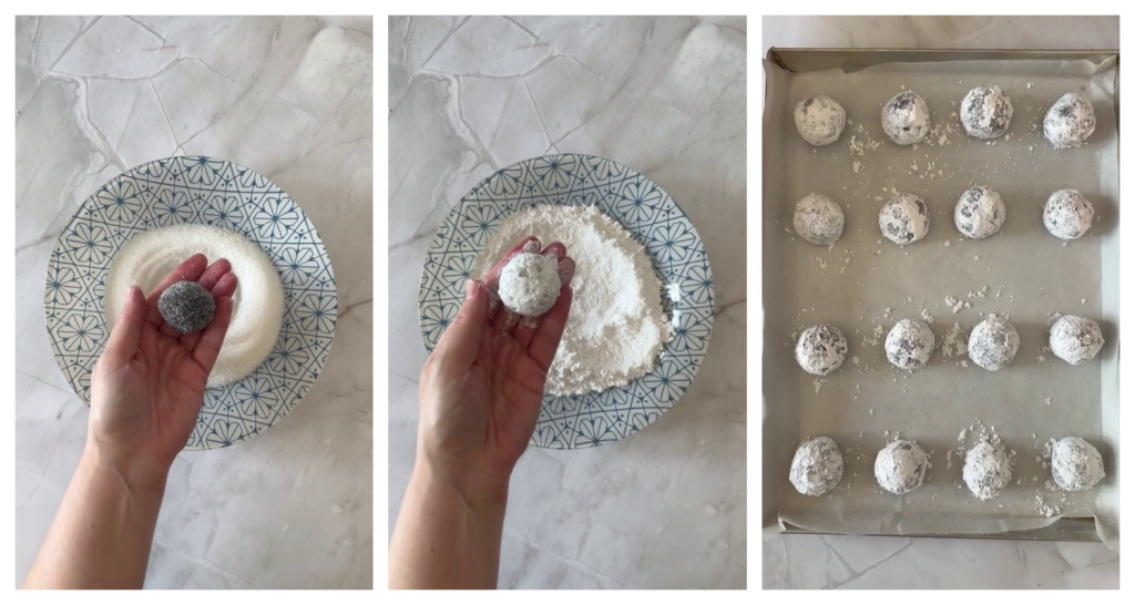 To achieve the characteristic cracks, it’s important to generously coat the dough with powdered sugar before baking. The dough expands in the oven, creating cracks on the sugared surface.