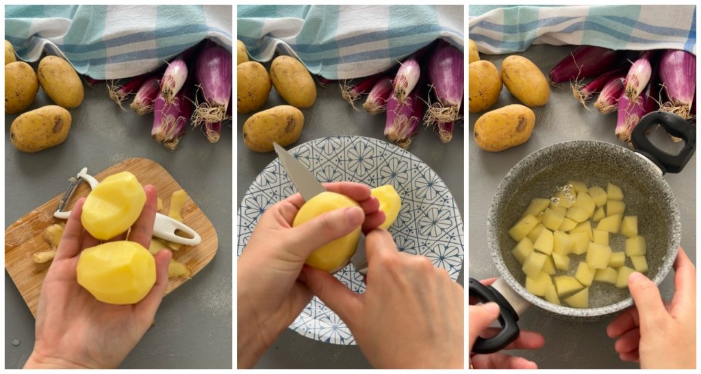 • To prepare the Greek Potato Salad, first peel the potatoes, wash them well, cut them into chunks (not regular), and cook them in salted boiling water. They will be cooked when you can easily pierce them with a fork. Drain and let them cool slightly.