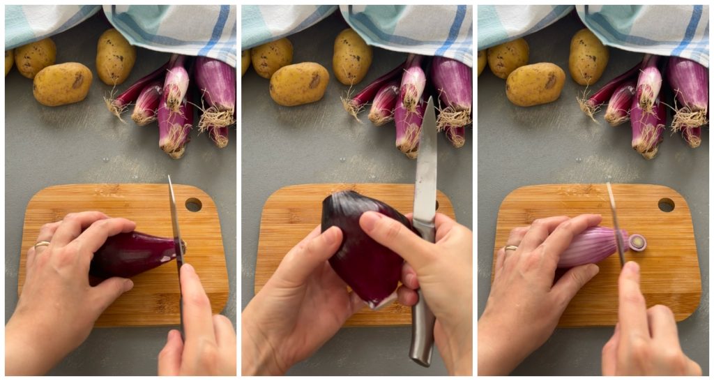 • Peel the onion, remove the outer leaves, wash it, and cut it into thin slices.