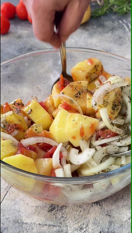 The potatoes, cut into pieces and cooked with the chicken, become soft and flavorful, soaked in the meat’s cooking juices. The addition of diced tomatoes and sliced onions creates a tasty and slightly moist base, perfect for accompanying the chicken and potatoes. A generous drizzle of extra virgin olive oil completes the dish, giving it a golden texture and rich flavor.