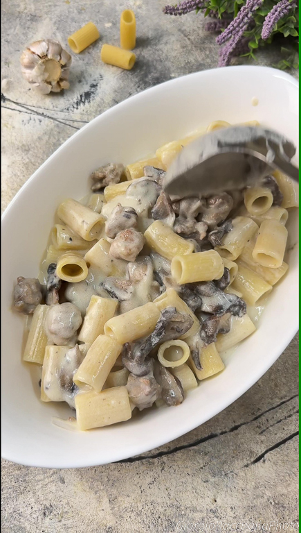 • Meanwhile, cook the pasta al dente and drain it. Mix it with the sausage and mushroom sauce,